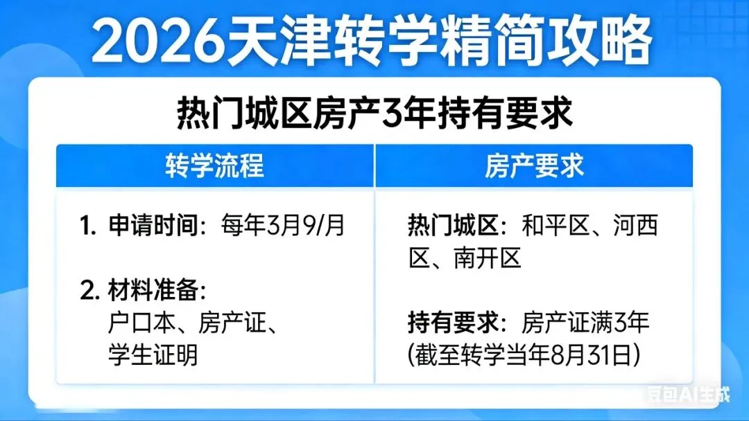 中途来津定居的家长,最关心的核心问题只剩一个:孩子现在的年级,到底能不能转天津? 2026年天津转学政策已明确全市统一标准,热门城区房产要求、材料清单也已敲定,记住这些关键节点,避免白跑浪费时间。