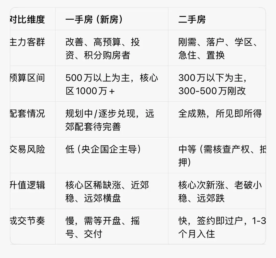 1. 刚需必选二手:300万以下预算,优先中环内地铁口次新/老破小,即买即住、配套成熟、流动性强;