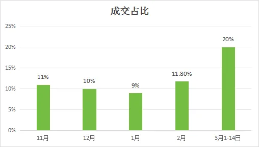 对比前四个月,可以看出一/二楼及顶楼成交占比约10%左右,而三月份前14天成交占比达到20%,说明目前市场上中间楼层房源价格差距拉大,从而凸显了此类楼层房源的性价比,进而促进客户的选择。这也说明了目前市场的热度不低,非热门房源成为部分客户不得已的选择。
