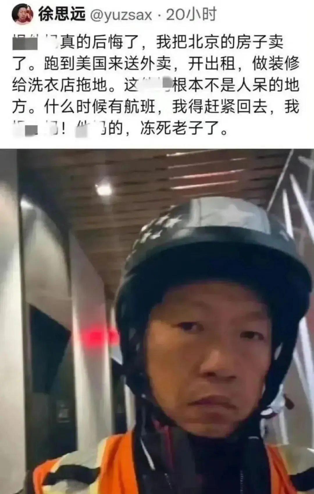 到了美国,他投出的简历石沉大海——国内的教授头衔,在美国根本不被认可。没有美国学位,没有本地工作经验,他连普通白领的工作都找不到。积蓄一天天减少,焦虑一天天增加。为了活下去,他开始从事最底层的体力活:曾经在大学讲台上侃侃而谈的经济学博士,如今在纽约的寒风中骑着电动车送餐。三年时间,1200万人民币的积蓄,消耗殆尽。他们一家从最初的公寓,搬到了纽约阴暗潮湿的地下室。这还没完。在美国,他饱受歧视。有一次被白人辱骂殴打,报警后却不了了之。甚至连他赖以谋生的电动车,也被偷走了。“真的后悔了,我把北京的房子卖了。跑到美国来送外卖,开出租,做装修,给洗衣店拖地。这根本不是人呆的地方。什么时候有航班,我得赶紧回去,冻死老子了。”04 扭曲的心理:既跪舔,又后悔