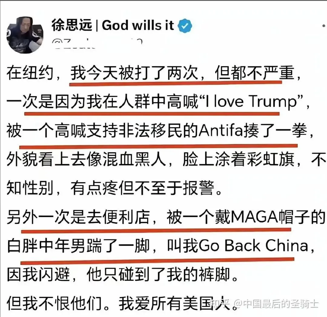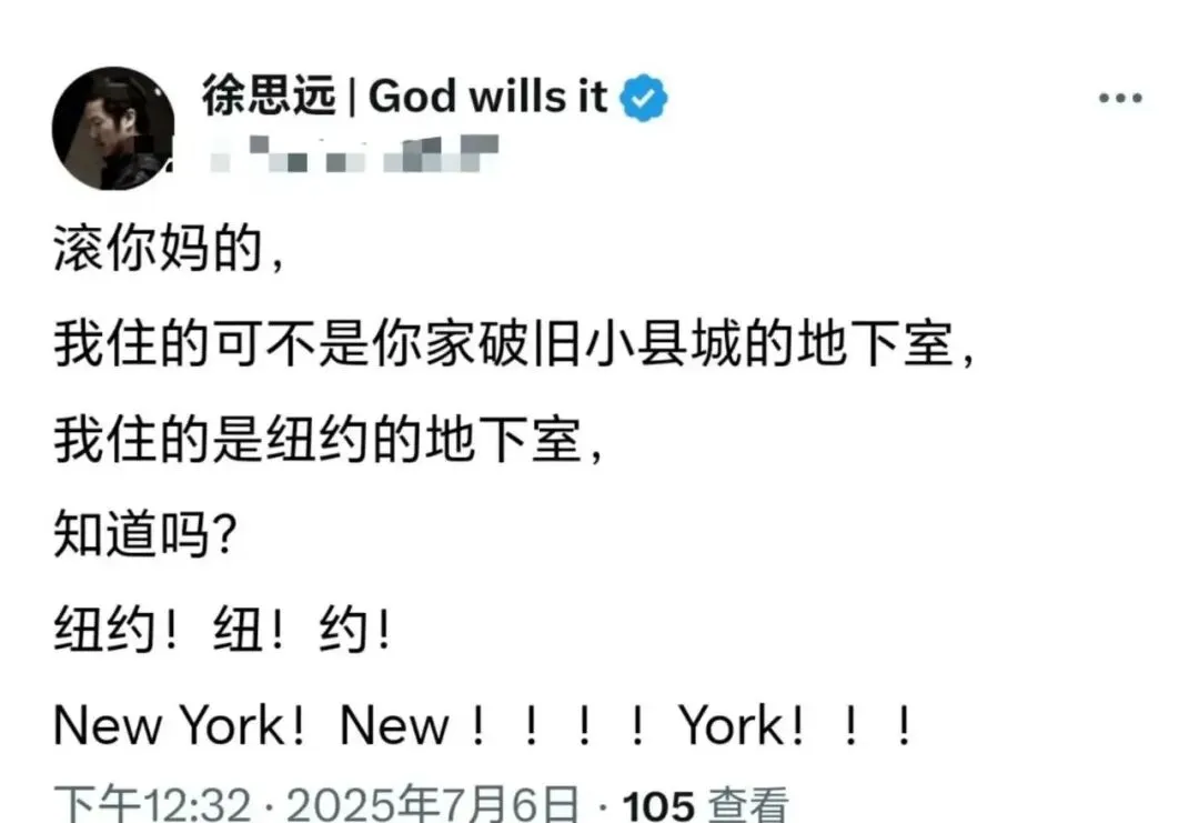 如果你以为他只是一时后悔,那就错了。徐思远的矛盾,已经到了近乎病态的程度。“滚你妈的,我住的可不是你家破旧小县城的地下室,我住的是纽约的地下室,知道吗?纽约!纽!约!NewYork!New!!!!!York!!!”在他眼里,哪怕同样是地下室,只要是在纽约,就比国内“高级”。更令人瞠目结舌的是,他曾公开表达过一些极其扭曲的想法:· 他幻想妻子出轨白人男性,因为这样可以“改善后代基因”· 他曾说“被白人打也比被中国人打好”· 他甚至怀疑自己的儿子有“白人血统”才好看‘。可另一方面,他又不断抱怨美国的生活—— 太冷、太苦、太孤独、太没尊严。他想回国,但又拉不下脸承认自己选错了。他就在这种“跪舔”和“后悔”之间反复横跳,精神状况越来越不稳定。05 最可悲的,是他的家人