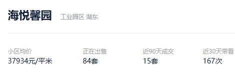 根据贝壳信息显示,海悦馨园目前84套挂牌出售,挂牌均价37934元/平。