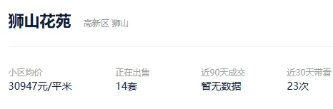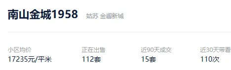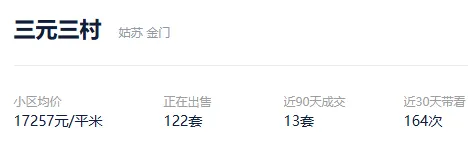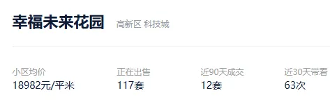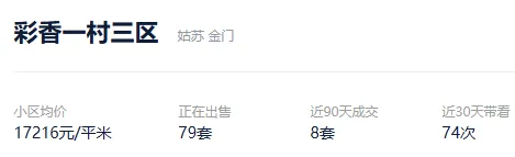 根据贝壳数据显示,今年以来,该社区成交了19套二手住房,套均成交面积74.43平,平均挂牌单套总价115万元,挂牌单价15493元/平,平均成交周期264天。