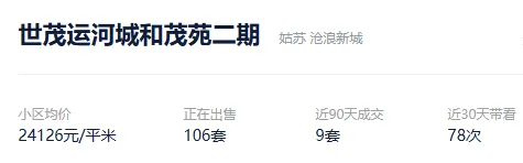 根据贝壳数据显示,今年以来,该社区成交了9套二手住房,套均成交面积123.84平,平均挂牌单套总价338万元,挂牌单价27267元/平,平均成交周期403天。