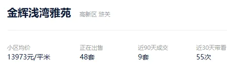 根据贝壳数据显示,今年以来,该社区成交了13套二手住房,套均成交面积97.83平,平均挂牌单套总价121万元,挂牌单价12381元/平,平均成交周期266天。