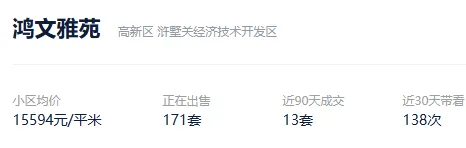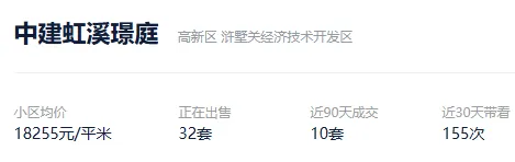 根据贝壳数据显示,今年以来,该社区成交了12套二手住房,套均成交面积98.25平,平均挂牌单套总价152万元,挂牌单价15488元/平,平均成交周期255天。