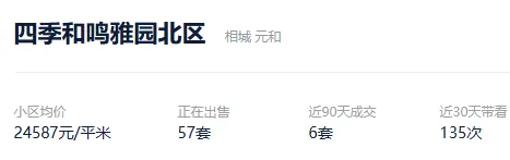根据贝壳信息显示,四季和鸣雅园北区目前57套挂牌出售,挂牌均价24587元/平。
