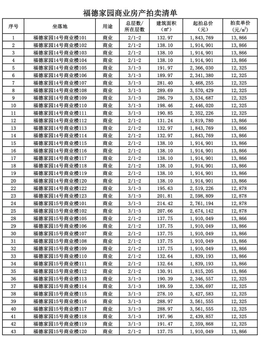 福德家园商业房产拍卖清单