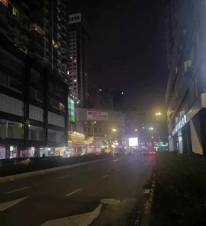 身后是一排已经完全亮起来的高楼。