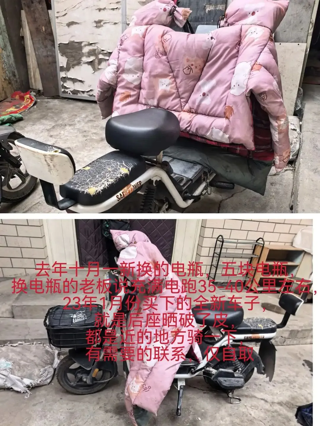 去年十月一新换的电瓶,五块电瓶,换电瓶的老板说充满电跑35-40公里左右,23年1月份买下的全新车子,就是后座晒破了皮,都是近的地方骑一下,有需要的联系,仅自取vx13283622578