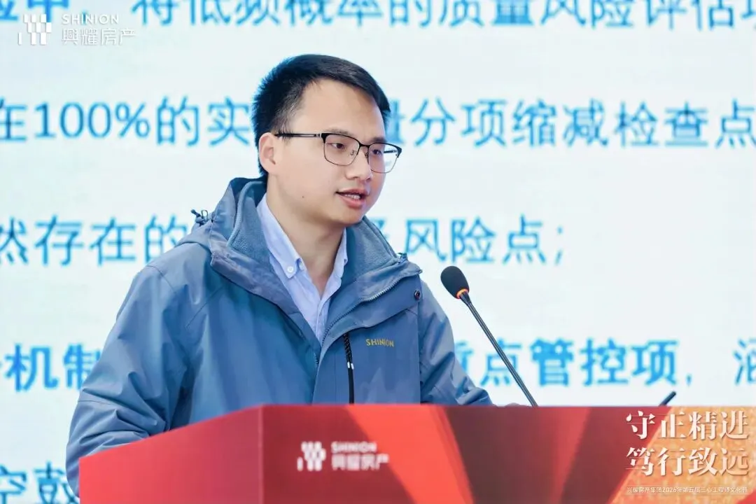 工程客服中心品控部经理夏剑诚宣讲《兴耀房产2025年工程品质分析及2026年品质精进要求》,总结过去一年各专业条线的品质表现,直面土建、精装等领域存在的薄弱环节。面向新一年,聚焦供应商上游原材料及厂家、过程闭环管控及标准精准落地,以系统性举措推动各专业品质痛点有效解决,持续夯实工程根基与交付口碑。