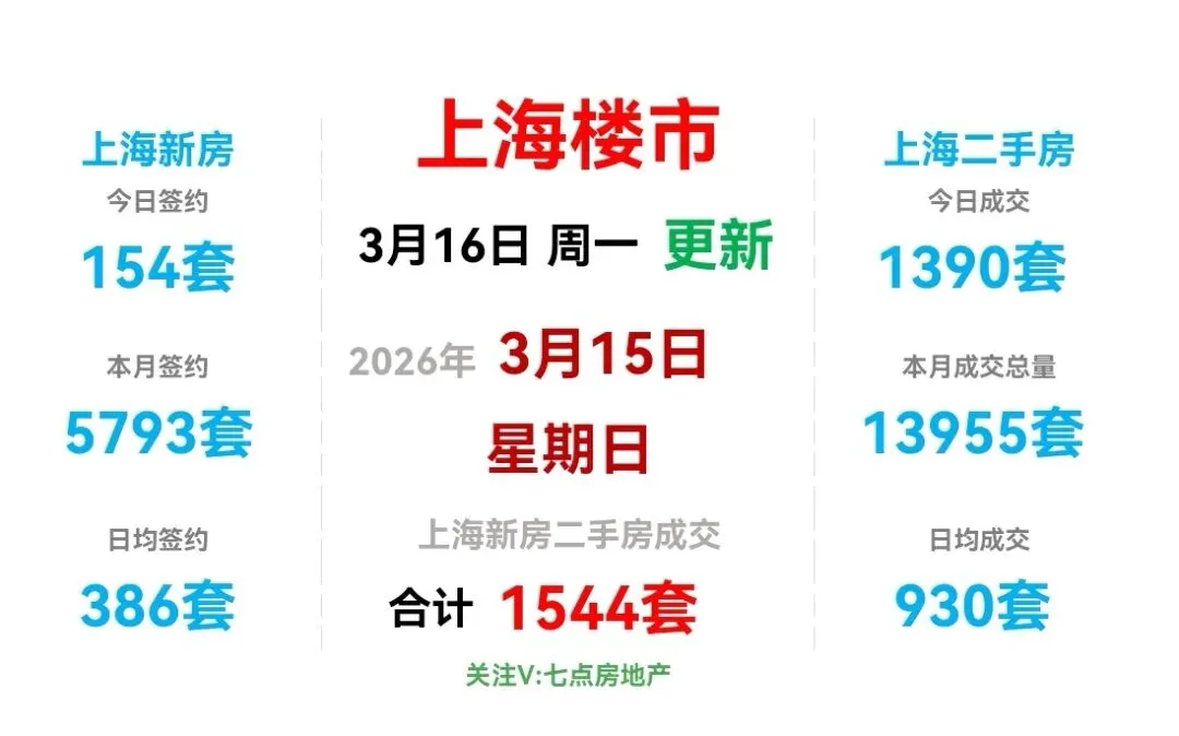 昨日(3月15日,周日),上海新房和上海二手房成交量合计1544套。