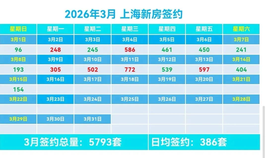 🏠3月上海新房总签约5793套,日均签约386套,本月签约总面积45.07万m²,套均面积77.12m²。