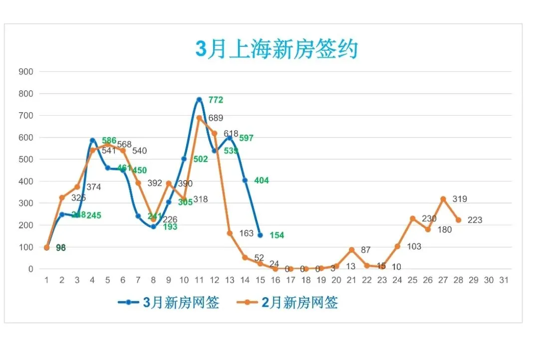 🏠昨日(3月15日,周日),上海新房签约154套,较前一日减少250套(降幅61.88%),日签约面积1.22万m²,套均面积79.22m²。