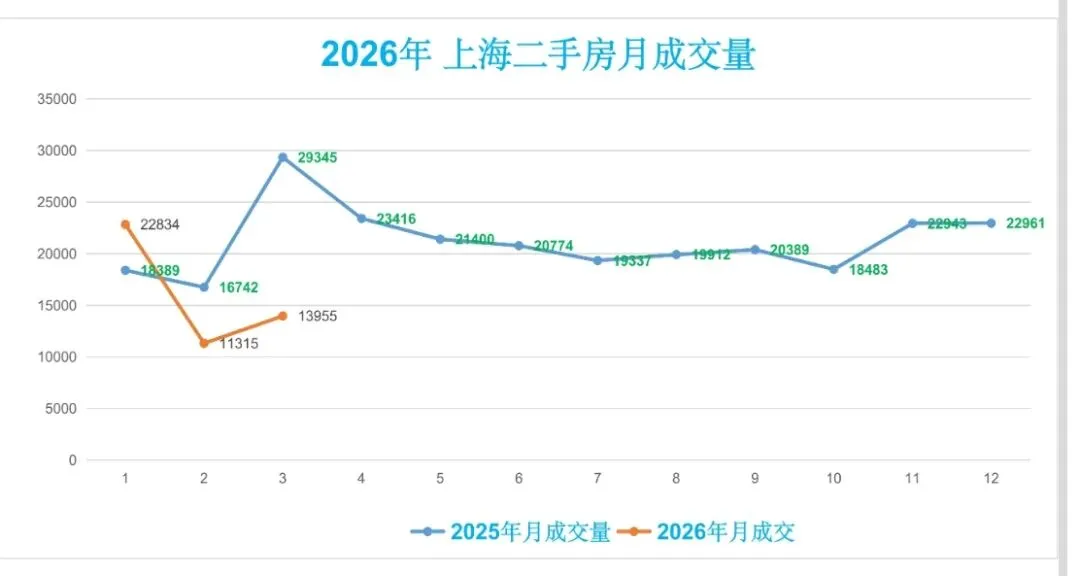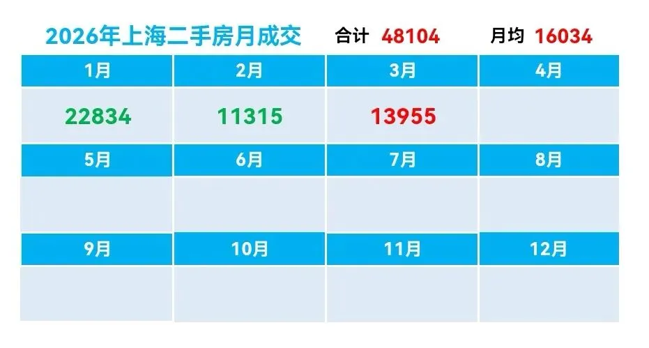 ♻️截止2026年3月15日,2026年上海二手房成交量合计48104套,月均21174套。