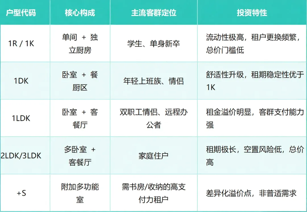 户型代码直接框定了该房产在租赁市场中的细分赛道。1K公寓与2LDK家庭公寓面对的租户决策逻辑完全不同,投资者应首先根据自身的资金规模与收益预期选择主攻赛道。