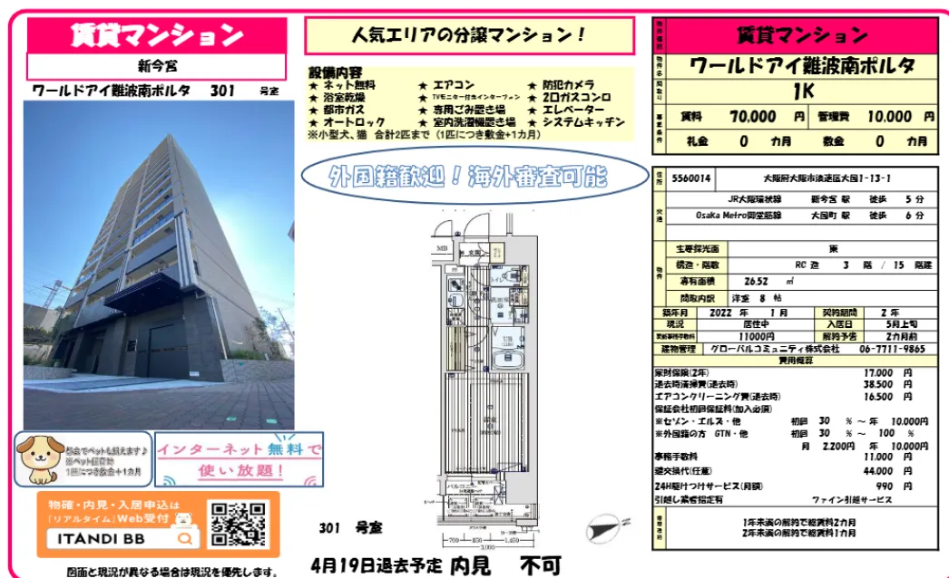 ✔ 敷金0 + 礼金0✔ 宠物可养(猫狗OK)✔ WiFi免费✔ 新今宫站5分钟✔ 难波生活圈