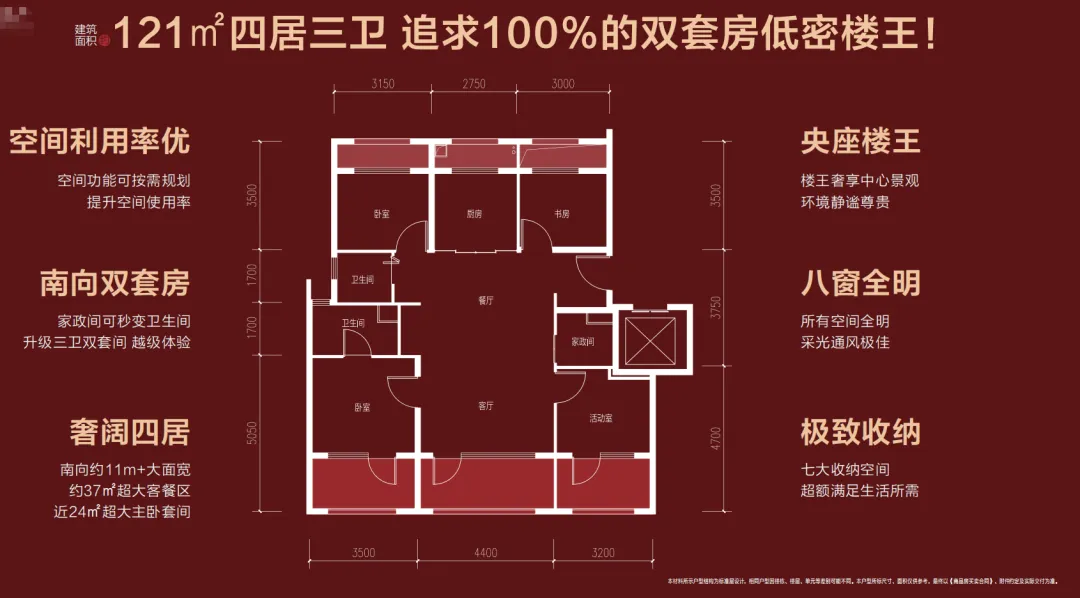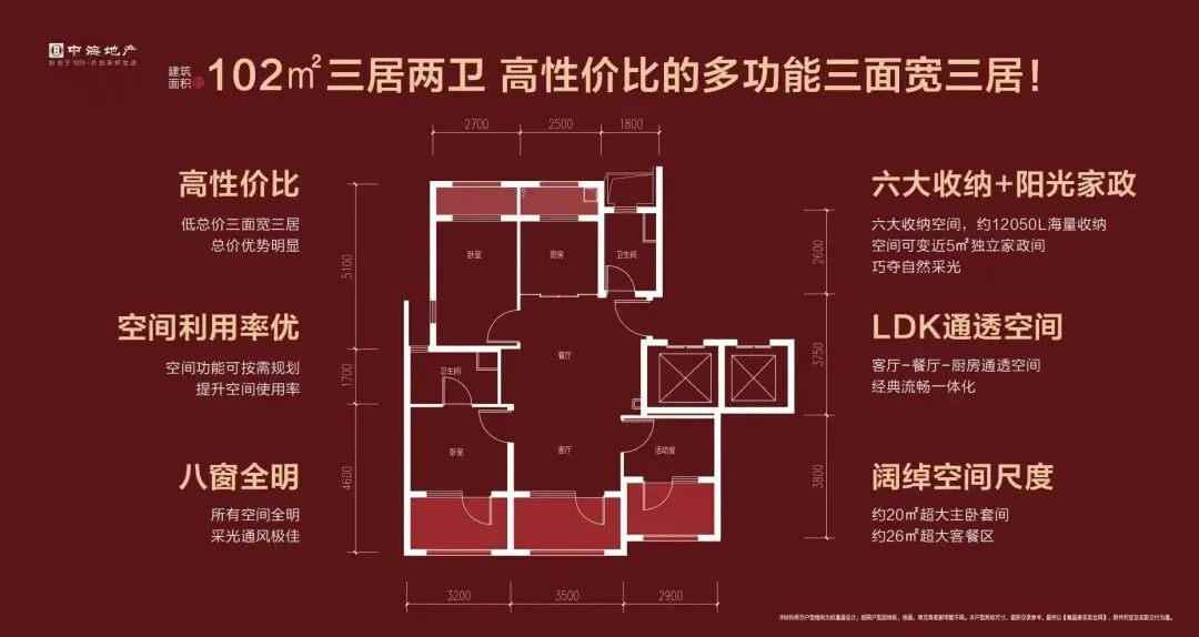 75㎡起步做三居,89㎡102平米三居两卫为主力,121㎡四居三卫,小面积多房间,利用率拉满,同价位竞争力极强。