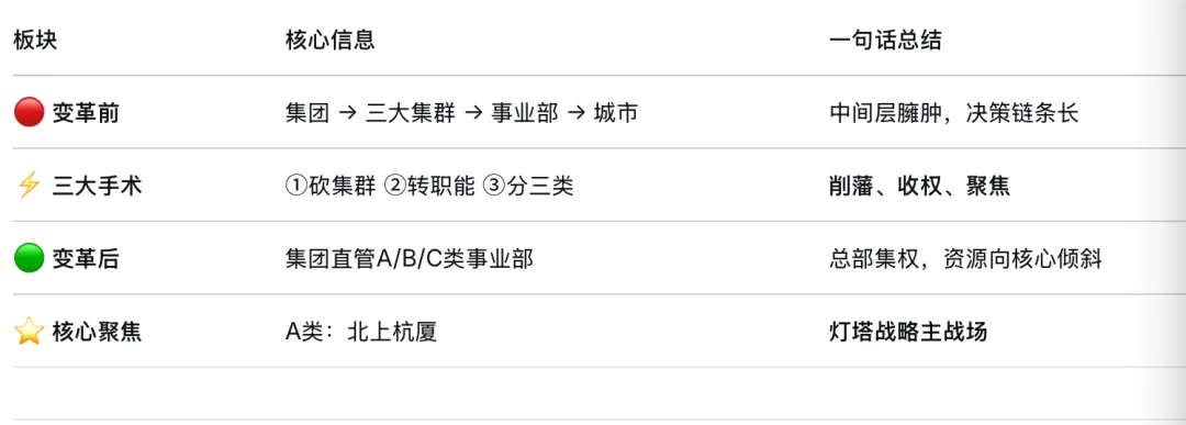 这意味着什么?以前是“集团-集群-事业部-城市”四级管控,区域集群手里有实权,能根据本地市场灵活决策;现在是“集团-事业部-城市”三级直管,从产品定价到工程节点,全由总部统筹。
