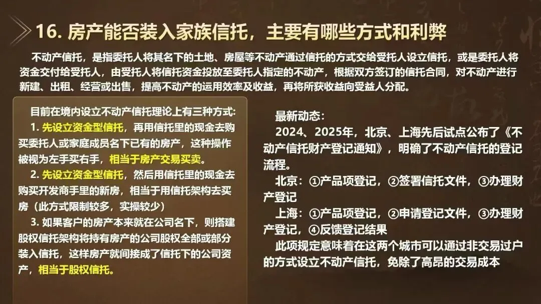 🌈Q16:房产能否装入家族信托,主要有哪些方式和利弊1⃣️目前国内设立不动产信托的主要方式是通过先设立资金型信托,让信托出面购置客户指定的房产,存在较高的交易成本2⃣️北京上海已经出台政策,允许以非交易过户的方式设立不动产信托☝️具体详情请看上图Q17预告:什么是离岸信托