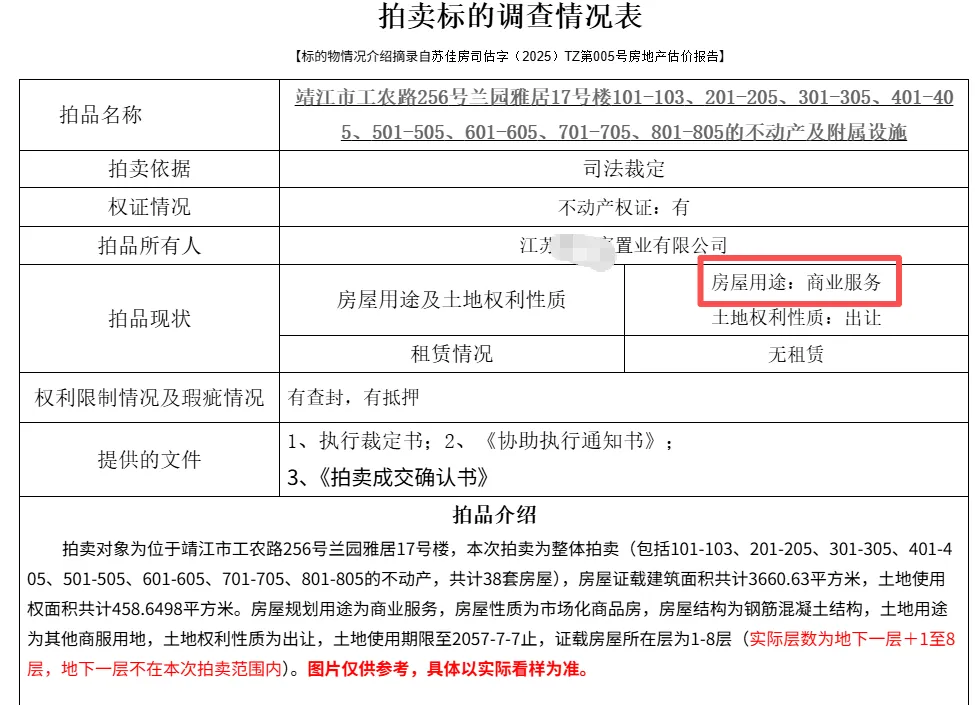 1、拍卖范围为:靖江市工农路256号兰园雅居17号楼101-103、201-205、301-305、401-405、501-505、601-605、701-705、801-805的房屋、占有范围内的土地使用权、不可移动的装饰装修及101、201室内可移动物品。