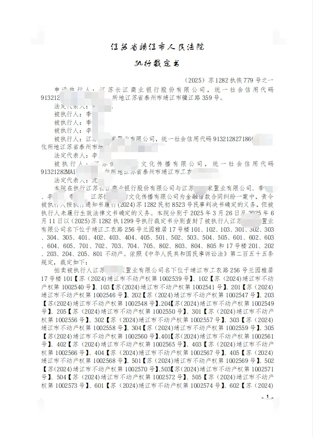 据靖江市人民法院的执行裁定书中显示:被执行人江苏**家置业有限公司因金融借款合同纠纷一案中未履行相关义务,遂其名下的该处房屋被上架拍卖。