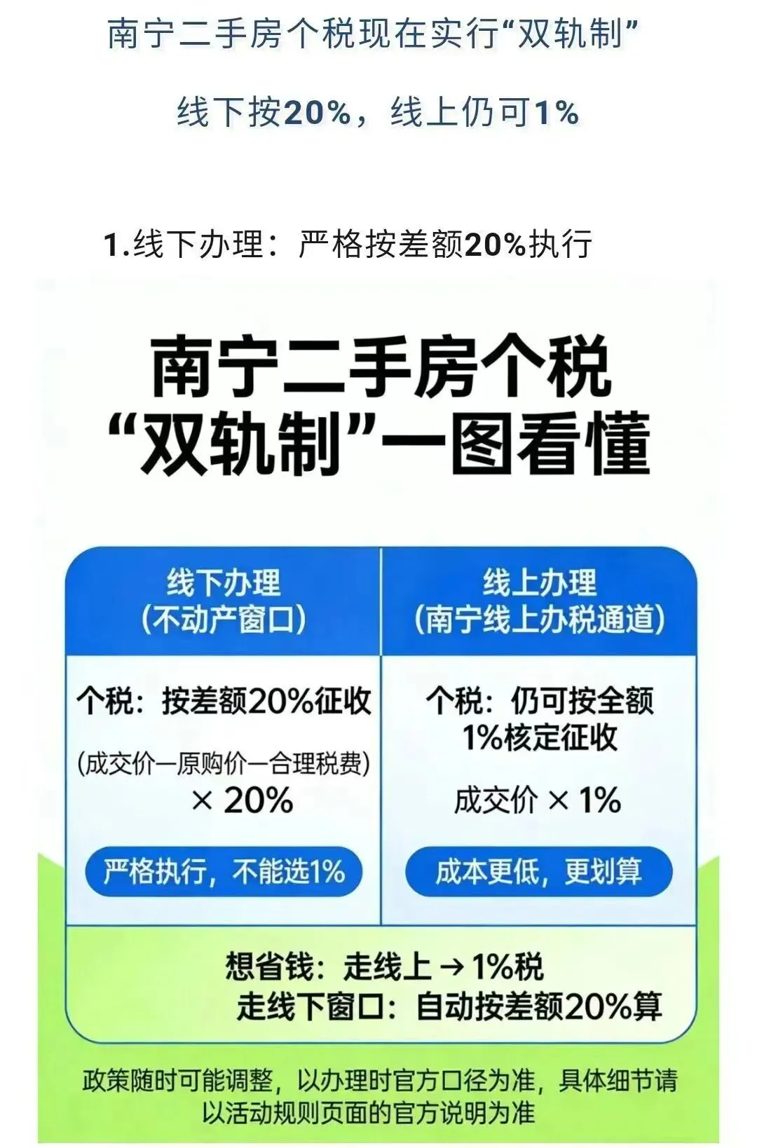 最后必须郑重声明:目前南宁二手房个税新政处于实操过渡期,线上和线下缴税的标准确实存在差异,本文所有的税费计算方式和实操技巧,均来自我 2026 年 2-3 月的真实过户经历,仅作参考。所有税费最终核定,一律以税务窗口和官方线上渠道的结果为准,后续政策若有收紧或调整,我也会第一时间在公众号跟大家同步。