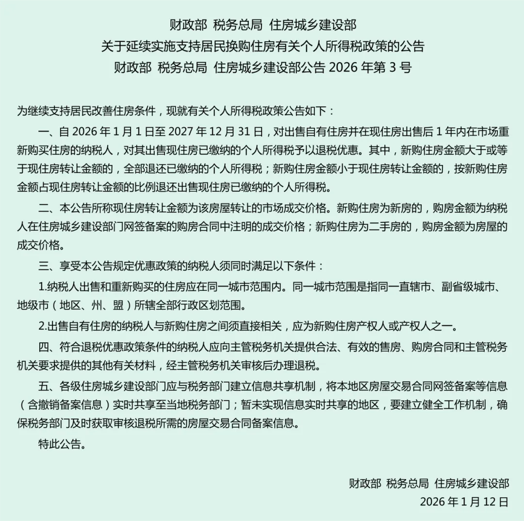 ✅ 卖旧买新退税:2026.1.1-2027.12.31 这两年间,卖完房 1 年内在南宁重新买房的,新购房金额≥卖房金额,个税全退;金额不够的就按比例退,这可是换房家庭的重要福利,别错过。
