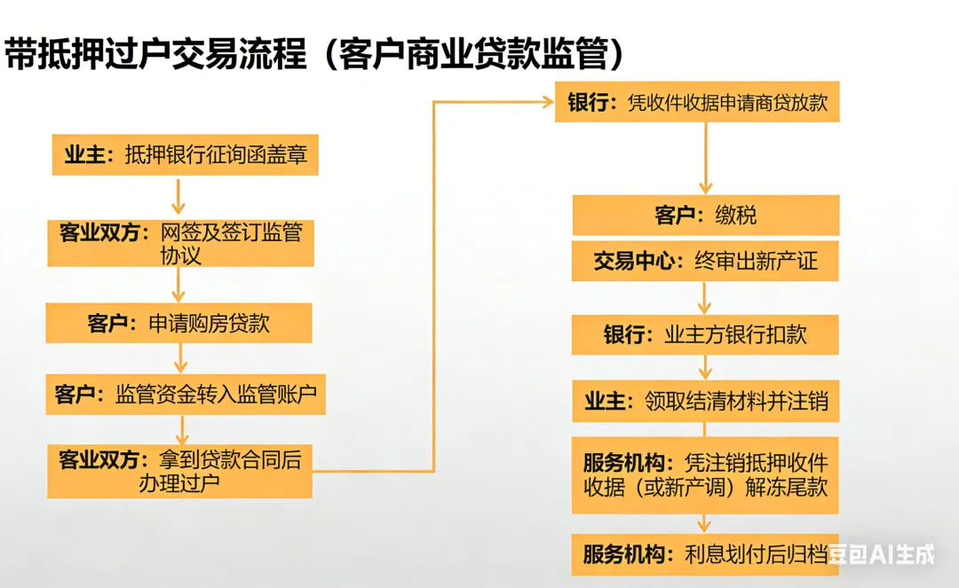 业主征询函盖章→买卖双方网签+签监管协议→买方申请商贷+转入监管资金→拿贷款合同后过户→银行凭收件收据放款→买方缴税→交易中心出新产证→业主银行扣款→业主领结清材料并注销抵押→服务机构凭注销材料解冻尾款→利息划付后归档。