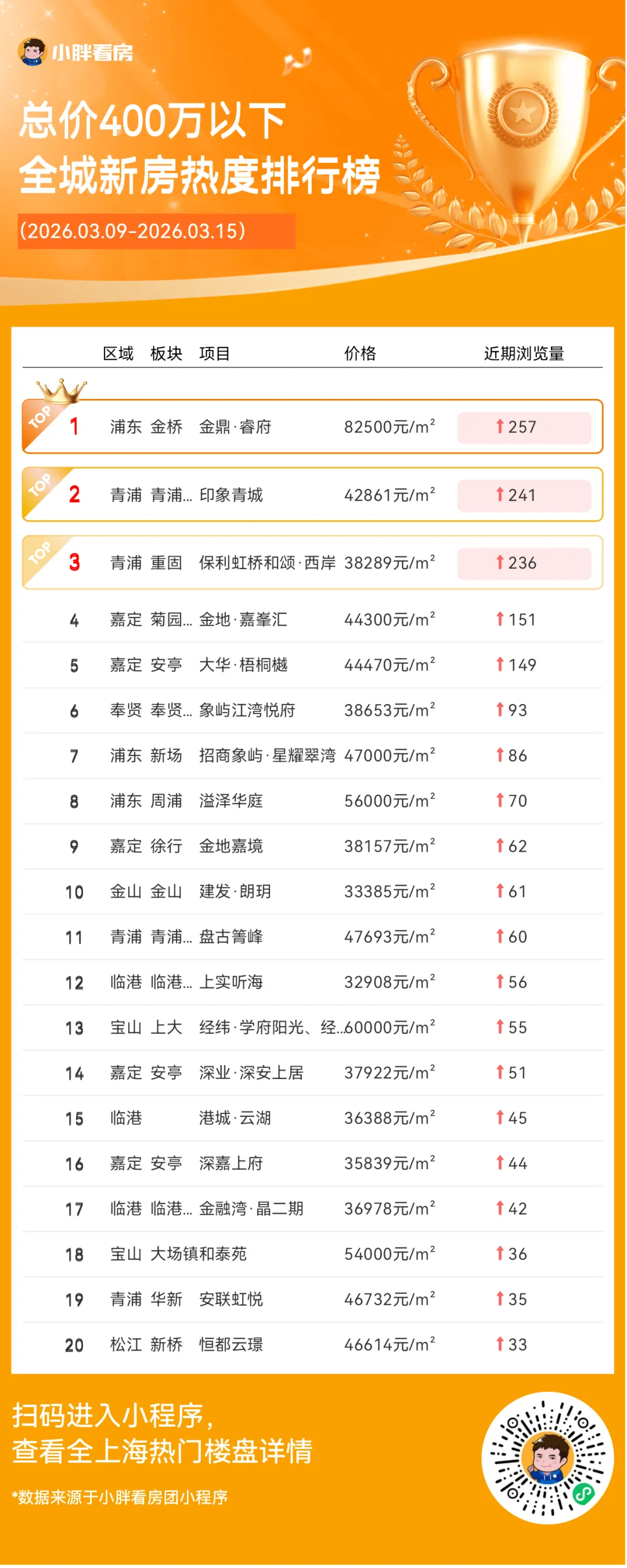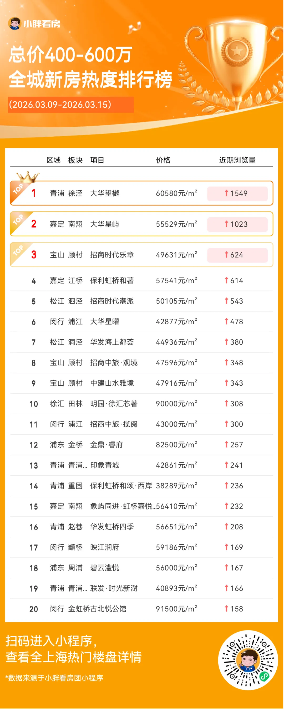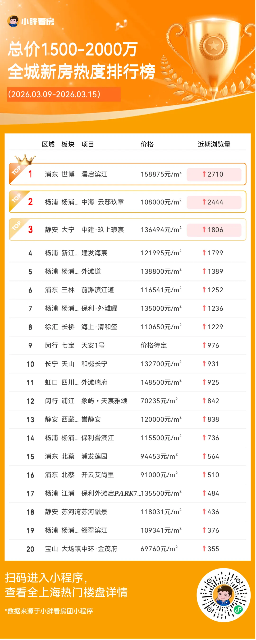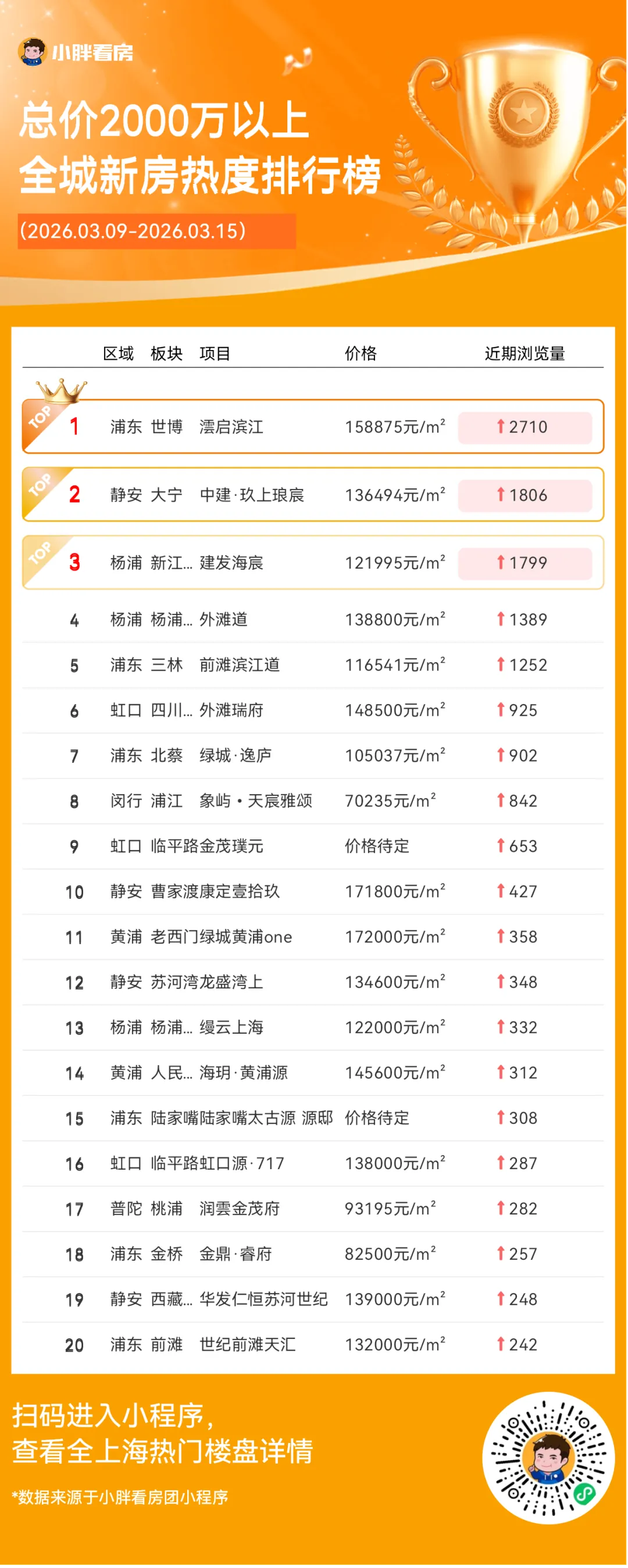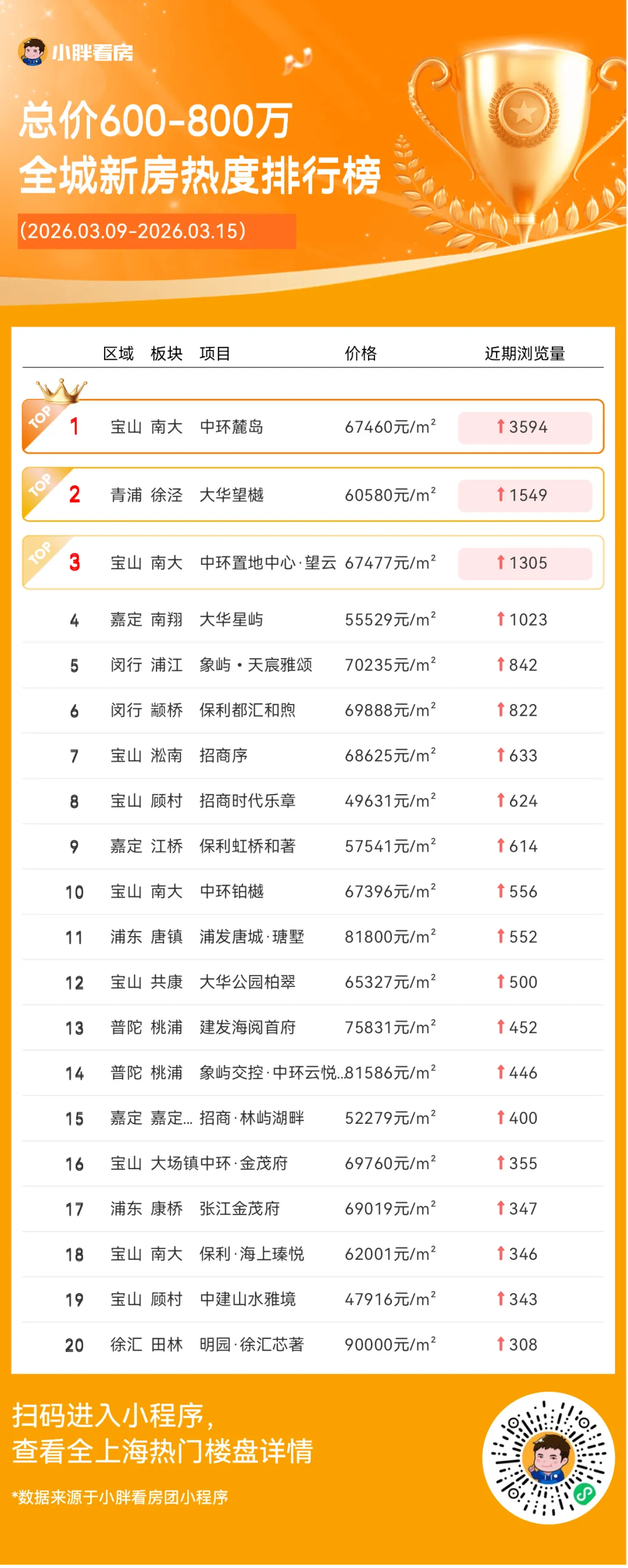 小胖看房团小程序发布一周新房热度榜单(根据新增浏览量排名),分全城榜和总价榜。看看本周谁的人气最高?你心仪的楼盘是否上榜吧~上海二手房最新成交量:昨日(3月14日)网签1390套(含住宅、商业、车位等)。