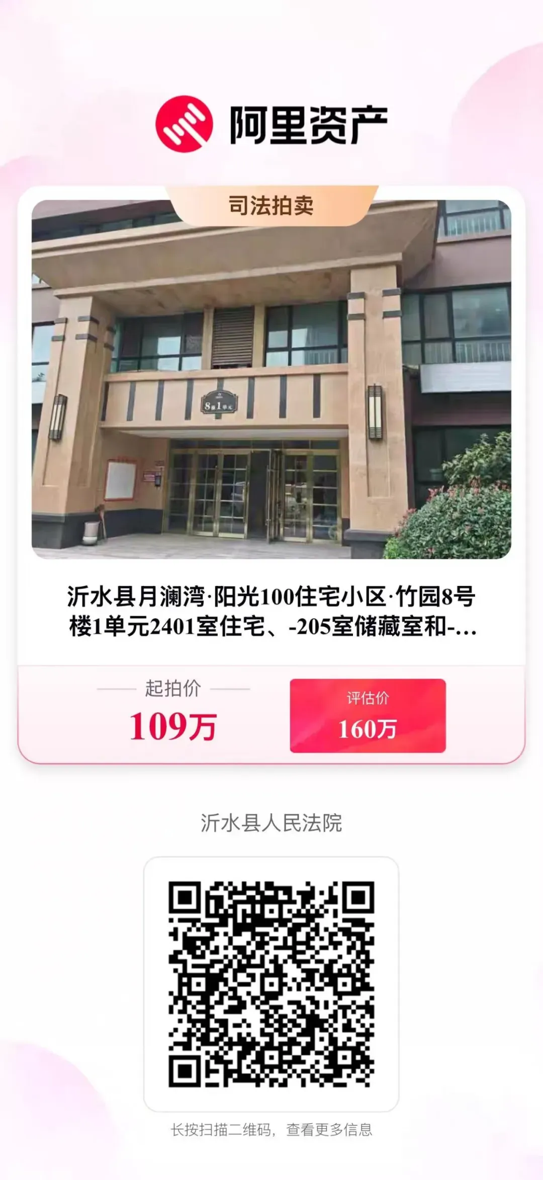 拍卖标的:沂水县月澜湾·阳光100住宅小区·竹园8号楼1单元2401室住宅、-205室储藏室和-1-498车位的房产一处