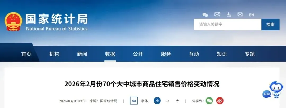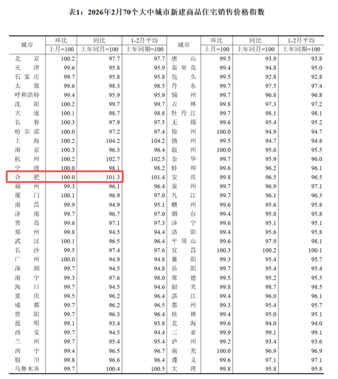 国家统计局3月16日最新发布,2026年2月70城房价指数正式出炉。合肥再一次跑出独立行情:新房同比上涨1.3%,环比持平,成为全国少数价格保持上涨的城市。