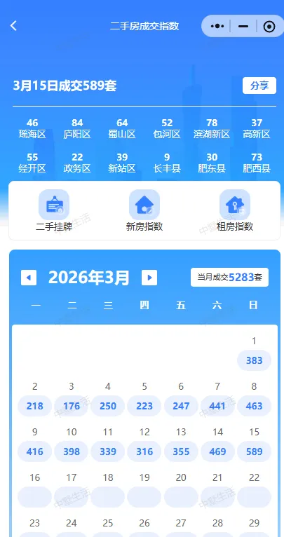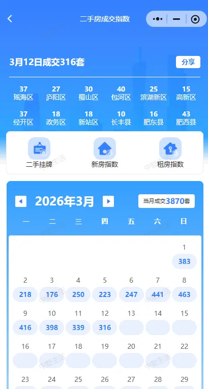 • 截至3月12日:合肥二手房成交3870套。