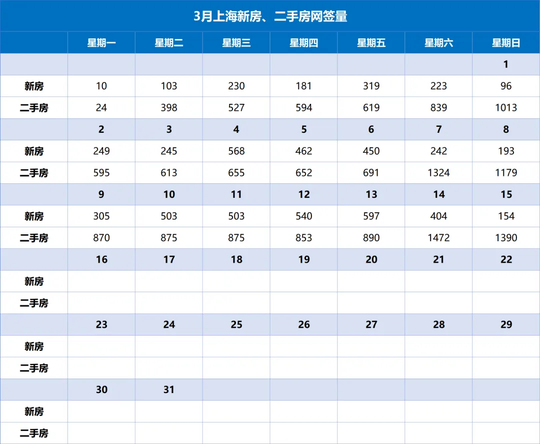根据网上房地产数据显示,上周(3月9日至3月15日),上海新房共计网签3006套,日均成交量约429套,增长25%。