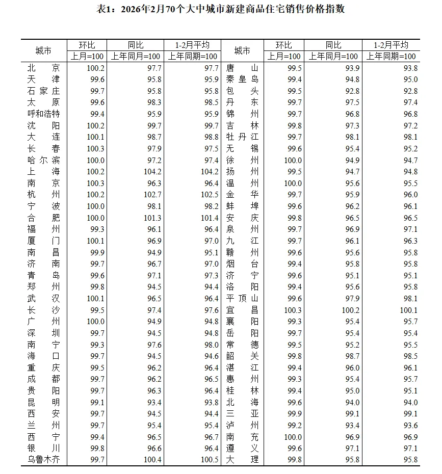 3月16日,国家统计局发布2026年2月份70个大中城市商品住宅销售价格变动情况。