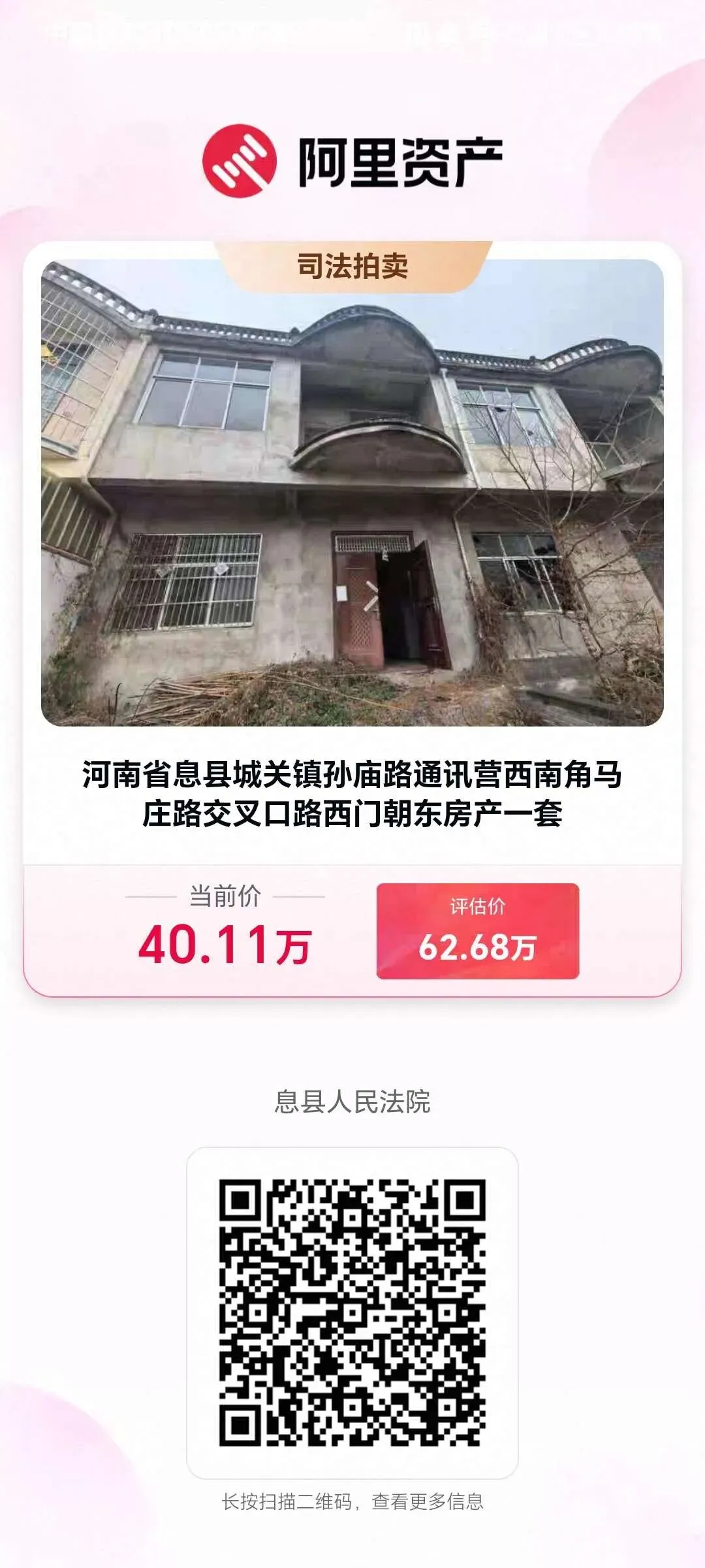 拍卖标的:河南省息县城关镇孙庙路通讯营西南角马庄路交叉口路西门朝东房产一套