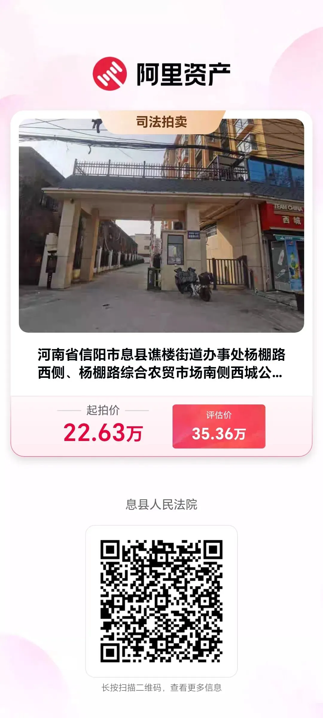 拍卖标的:河南省信阳市息县谯楼街道办事处杨棚路西侧、杨棚路综合农贸市场南侧西城公馆1幢1号楼3单元1102号房产一套