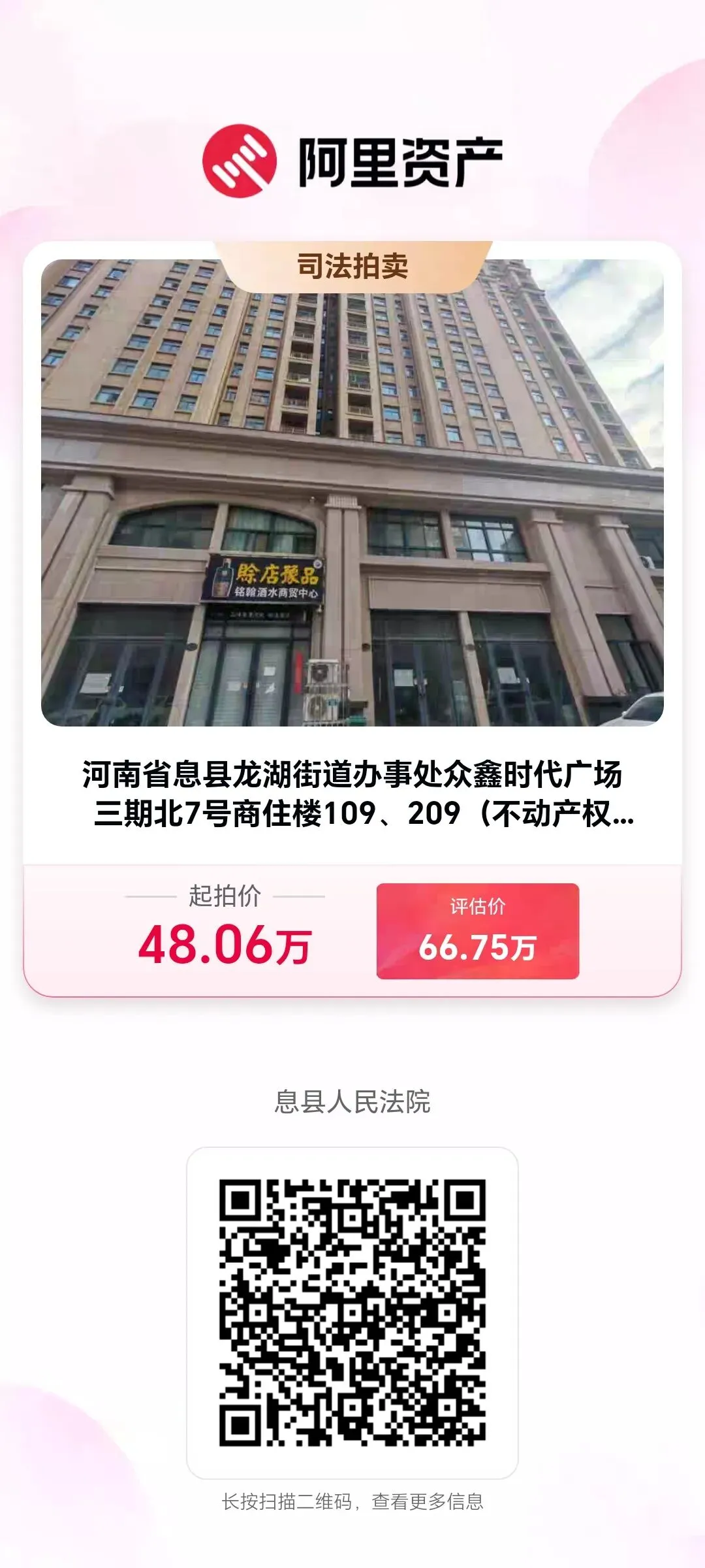 拍卖标的:河南省息县龙湖街道办事处众鑫时代广场三期北7号商住楼109、209