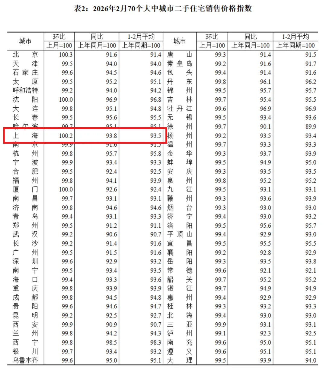 根据国家统计局刚刚公布的数据,2026年2月,上海二手房销售价格终于有了明显回暖,环比上涨0.2%!