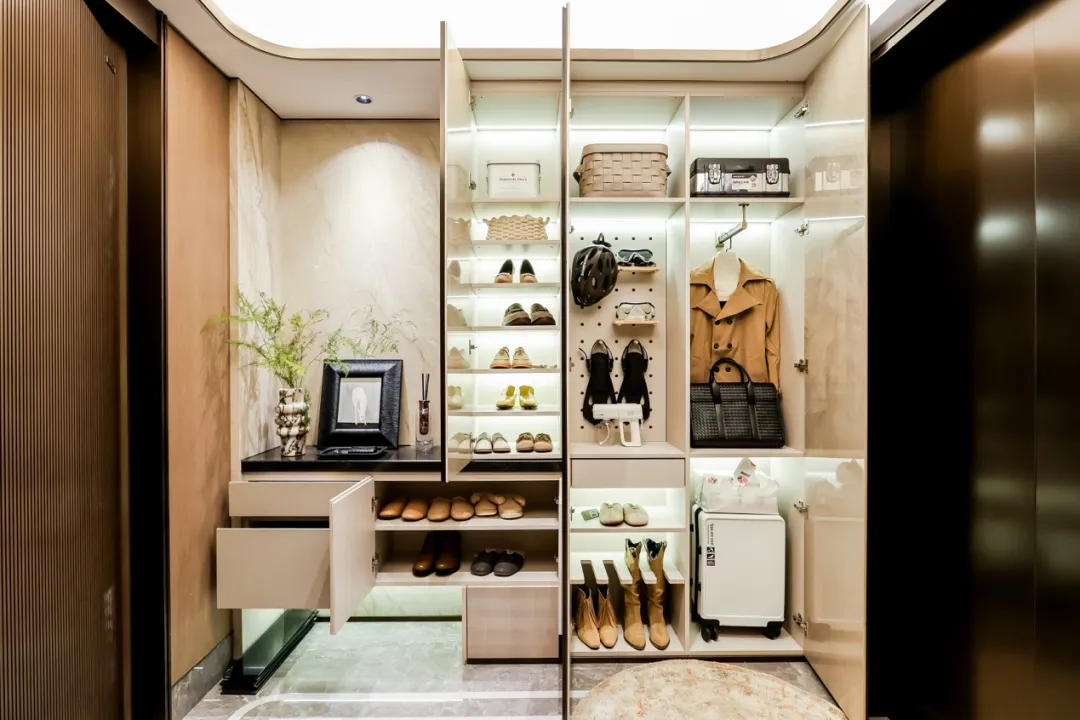 出电梯后,放伞、换鞋等工作都能在阳光梯厅完成,还能收纳家庭不常用的物品。