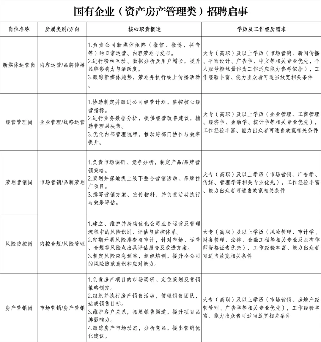 大专(高职)及以上学历(市场营销、房地产经营管理、广告学等相关专业优先),工作经验丰富、能力出众者可适当放宽相关条件。