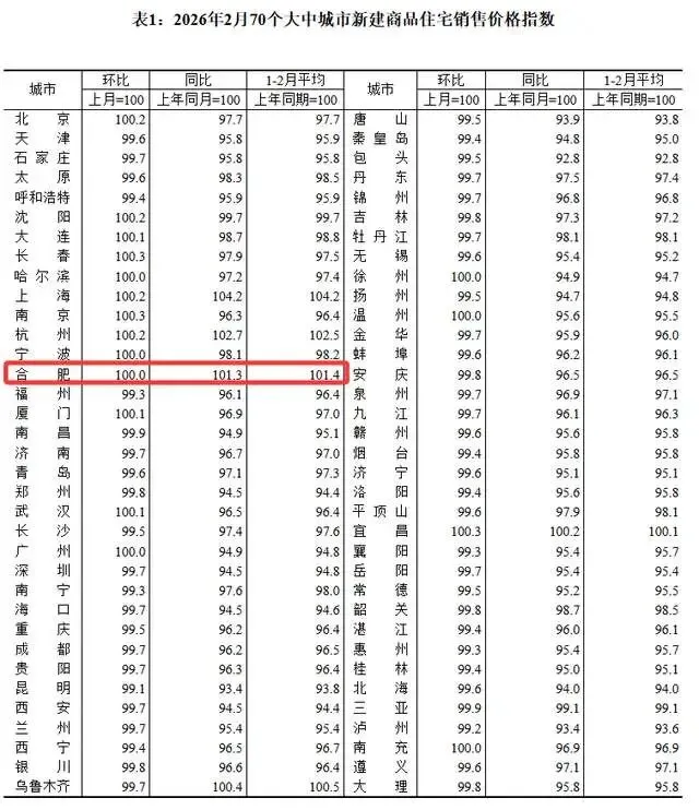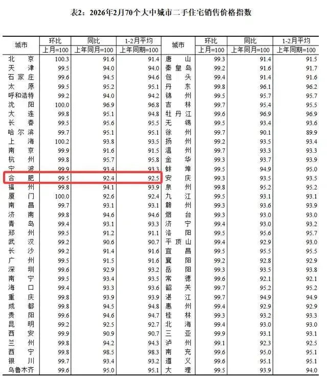 国家统计局刚刚发布 2026 年 2 月 70 城房价数据,合肥的表现依旧是新房稳、二手房跌,但跌幅在收窄。