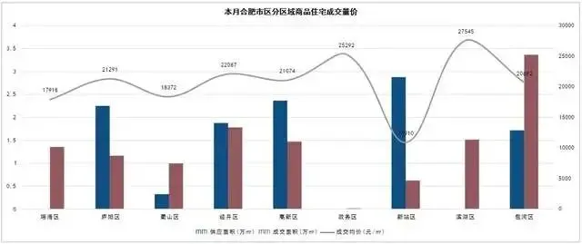 滨湖依旧是价格高地,均价 27545 元 /㎡;包河成交量最大;新站仍是价格洼地,单价在 1 万出头。