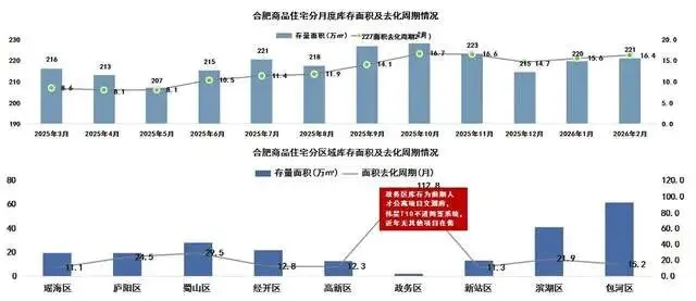 2 月一共 12 次推盘,整体认购率只有 6%,多数项目去化一般。目前市区狭义库存大概 221 万㎡,去化周期 16.4 个月,包河库存最高,蜀山去化周期偏长,市场还是以稳走量、去库存为主。