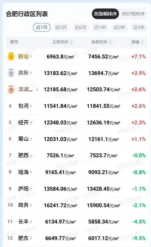 新站涨幅 7.1% 排第一,高新、滨湖、包河、经开也都在涨;肥西、瑶海、庐阳、政务、长丰、肥东这些区域,价格还在调整。