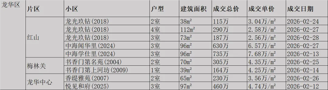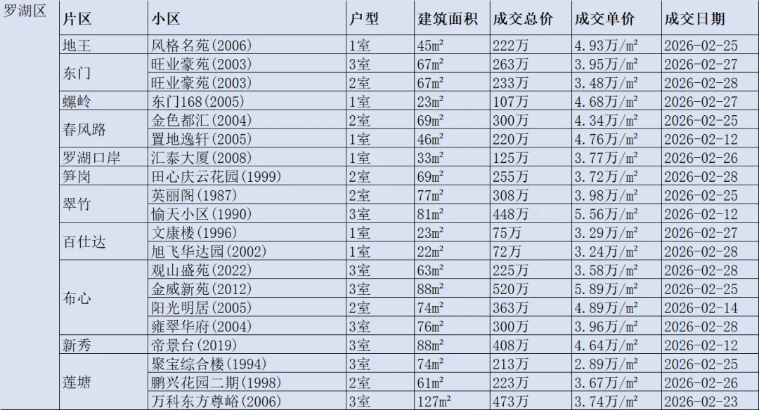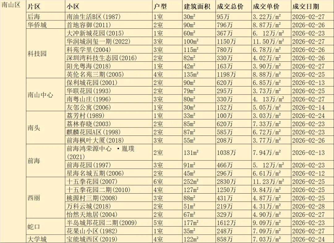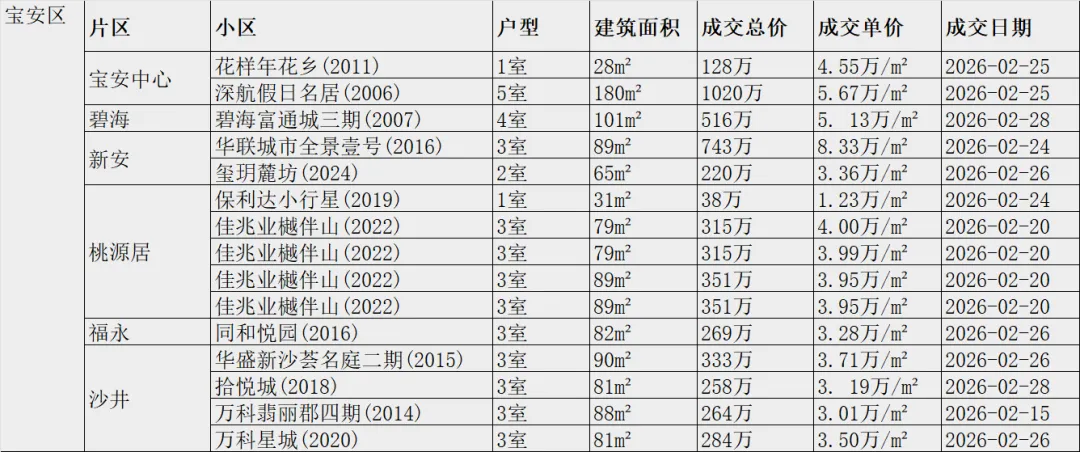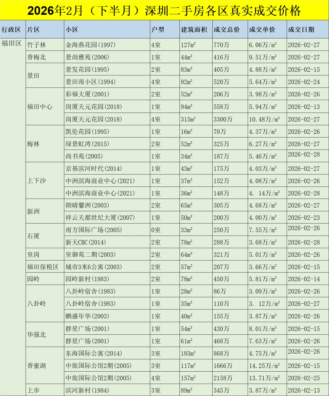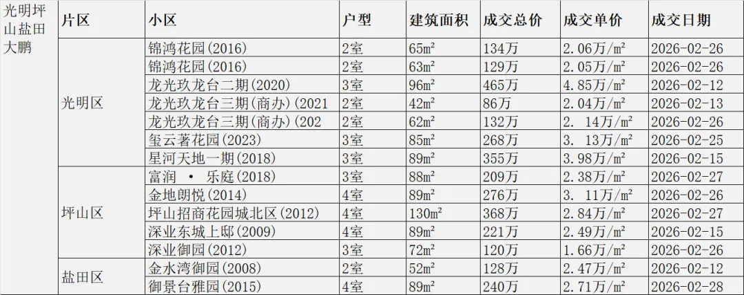 >重磅! 深圳2026年2月(下)二手房真实成交价数据表(含各区)