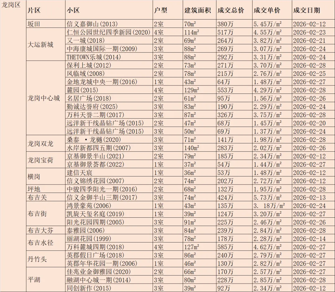 重磅! 深圳2026年2月(下)二手房真实成交价数据表(含各区)