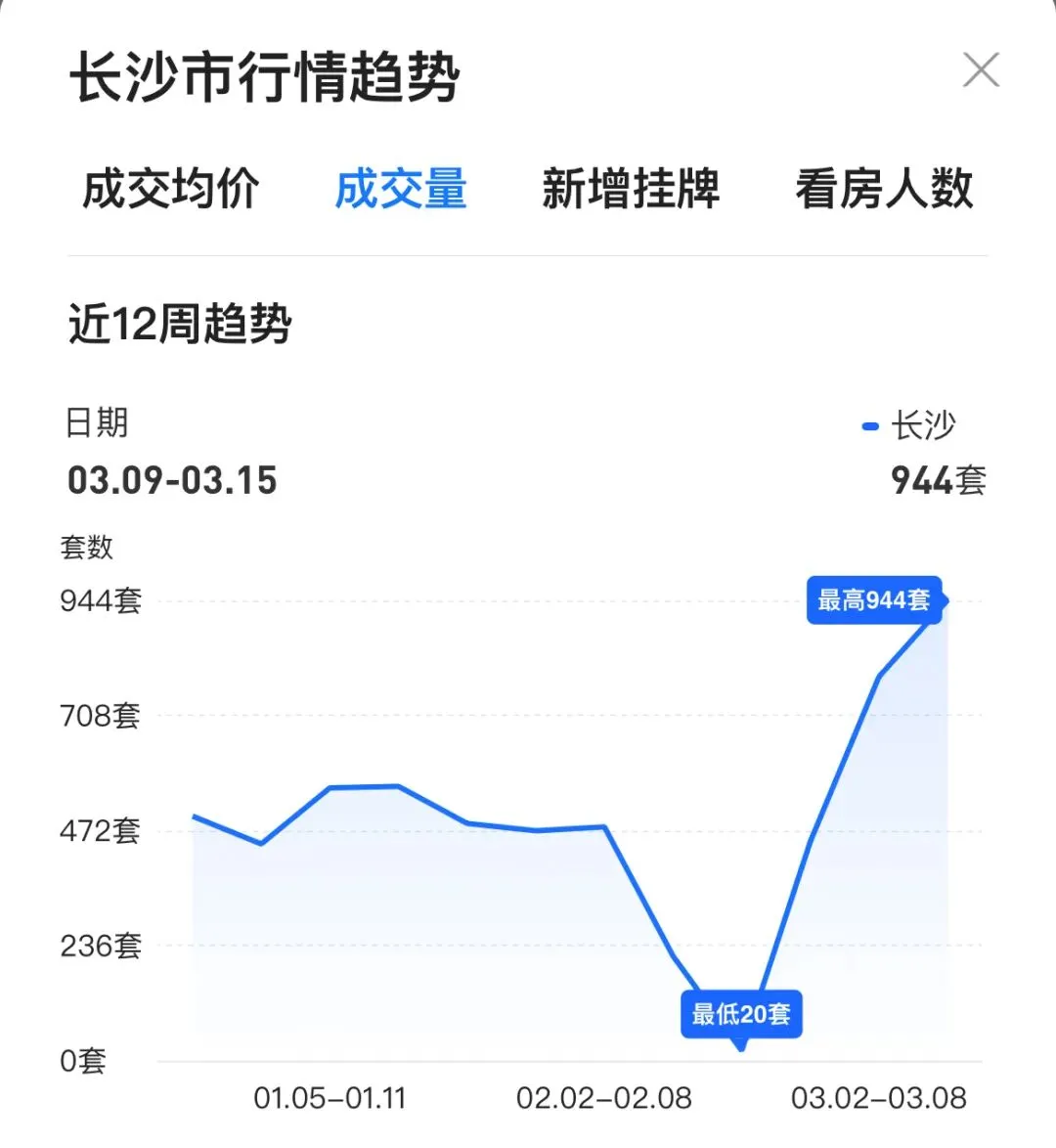 先看最真实的成交情况:进入 3 月,长沙二手房成交量出现明显跳涨。贝壳平台:3 月第一周成交 787 套,第二周 944 套,两周合计超 1700 套