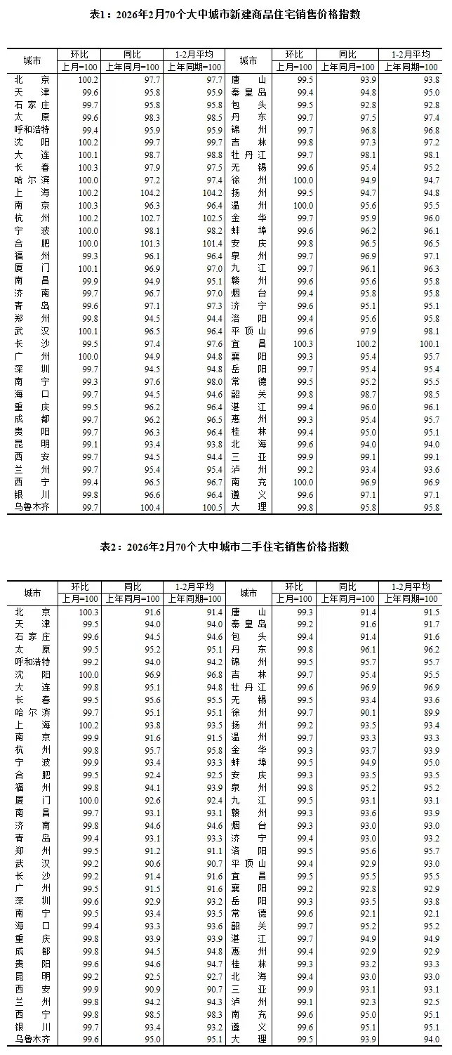 环比(2 月相对 1 月):指数99.7(<100),下跌 0.3%,跌幅小于新房。同比(2 月相对去年 2 月):指数93.1(<100),下跌 6.9%,跌幅显著大于新房。1-2 月累计:指数93.0(<100),较去年同期下跌 7.0%。三、结论