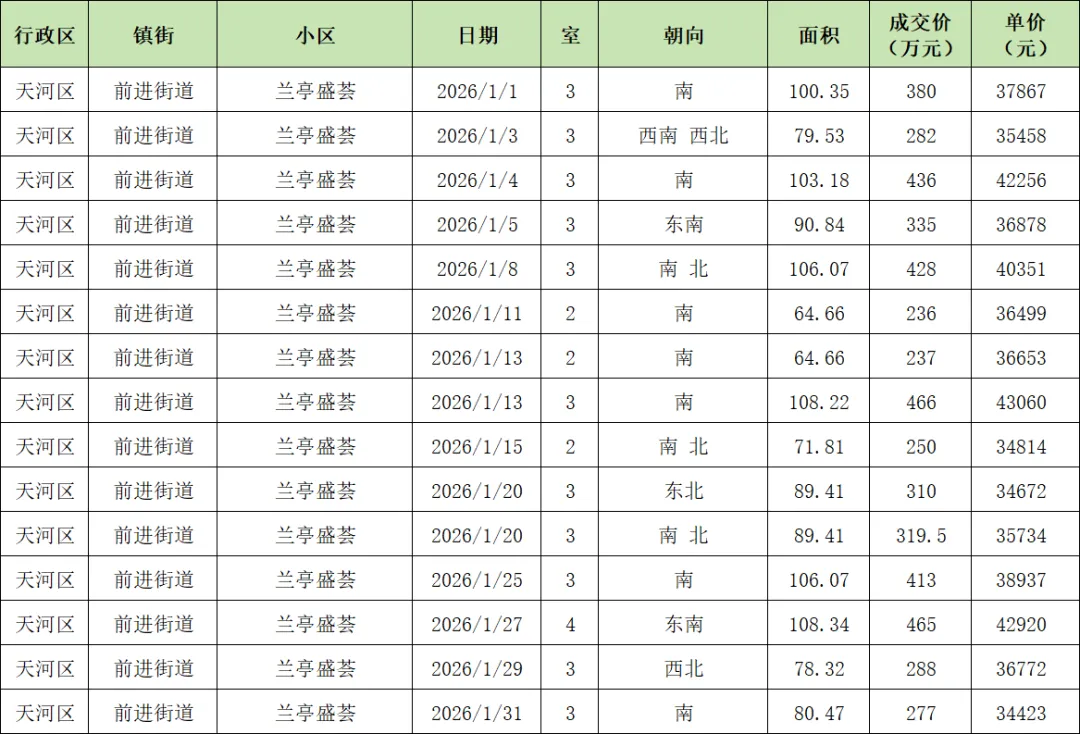 兰亭盛荟在2026年1月以15套的成交量领跑广州。市场核心特征是南北分化明显,南向房源价格占据绝对优势。成交中,南向房源占比超六成,单价集中在3.65-4.3万元/㎡,一套108㎡的南向三房单价更是达到43060元/㎡的高位。80-100㎡的中等户型是成交主力。在价格上,总价200-300万元的房源成交最多,占比近半;单价方面,3.5-4万元/㎡的房源是市场主流。整体来看,不同预算的购房者——从刚需到高端改善——在该小区均能找到适配选择,但朝向是决定单价的最核心因素,南向房源的价值得到了充分体现。